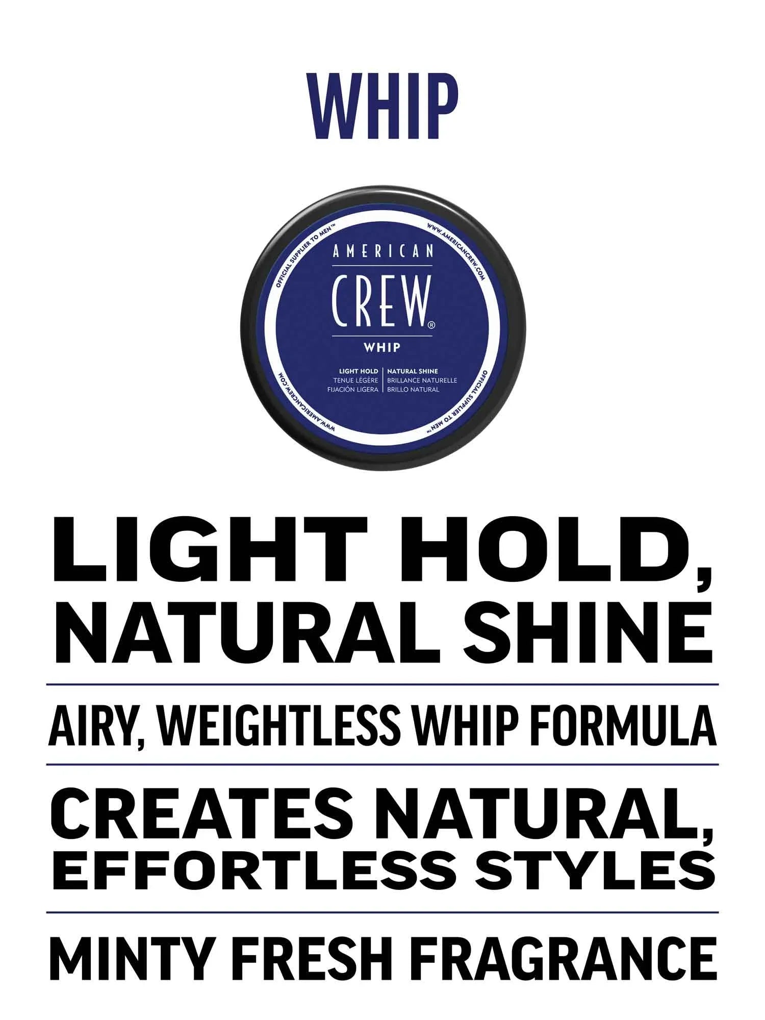 Take a small amount of American Crew Whip, rub it between your palms, and scrunch it into your hair to enhance separation and movement.