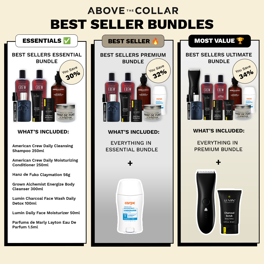 Give the gift of effortless grooming with Above The Collar’s Best Sellers Bundles, curated sets designed to elevate any man’s daily routine. Whether he’s looking for a quick refresh or the ultimate grooming upgrade, these limited-edition bundles feature premium men’s hair, skincare, and fragrance essentials from top brands like American Crew, Hanz de Fuko, Grown Alchemist, Lumin, and Parfums de Marly.