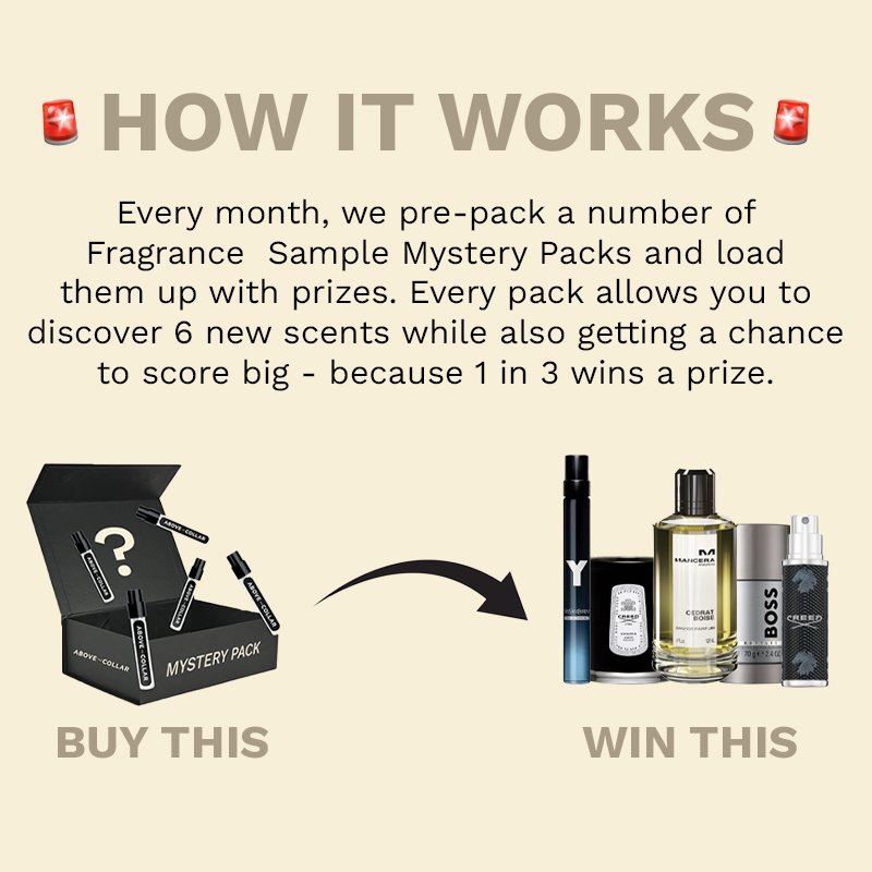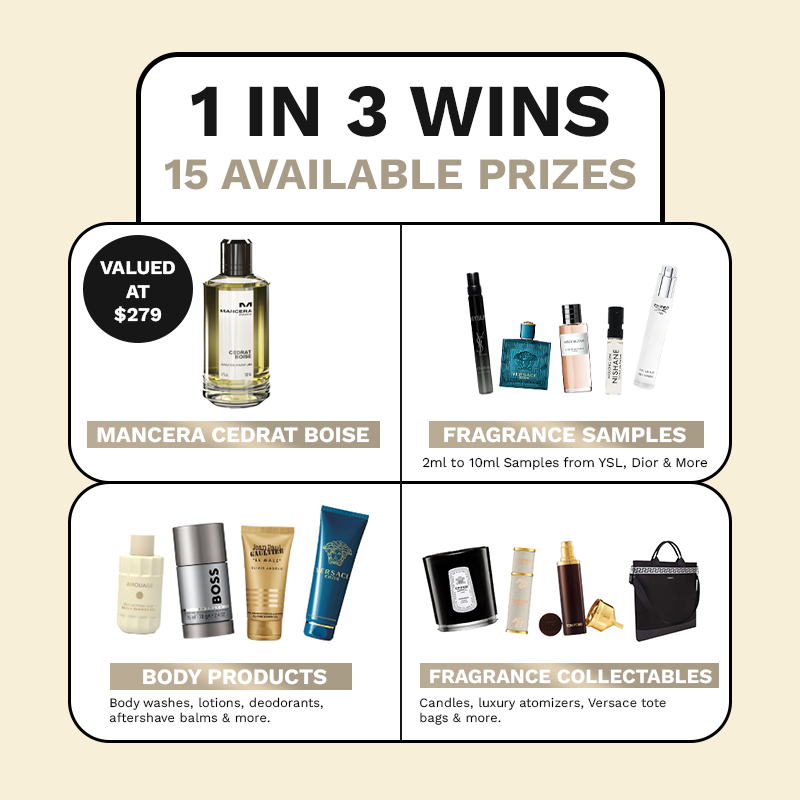 This month we pre-packed 45 Mystery Fragrance Sample Packs and allocated 15 prizes across the packs in random order. Purchase a Mystery Fragrance Sample Pack and have a 1 in 3 chance to win a prize.