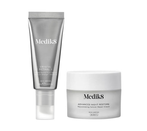 The Medik8 Crystal Retinal 3 and Advanced Night Restore Bundle is a powerful anti-aging skincare set that includes a night serum and cream to resurface, renew, and deeply hydrate the skin while reducing the appearance of fine lines and wrinkles.