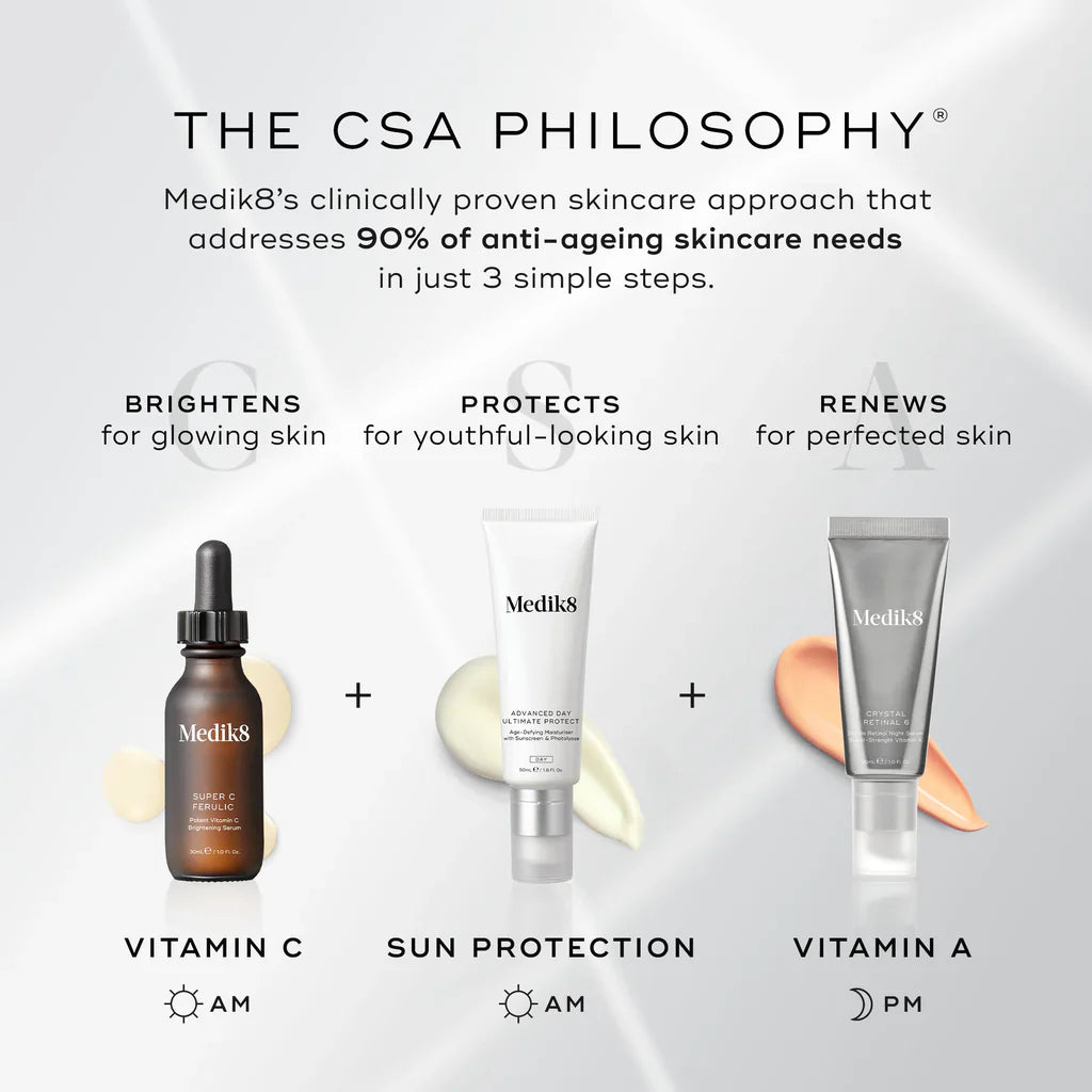 Medik8 Super C Ferulic Serum 30ml is a powerful vitamin C serum that boosts antioxidant activity to unparalleled heights, neutralizing the effects of environmental aggressors such as pollution and sun damage to restore a youthful glow.