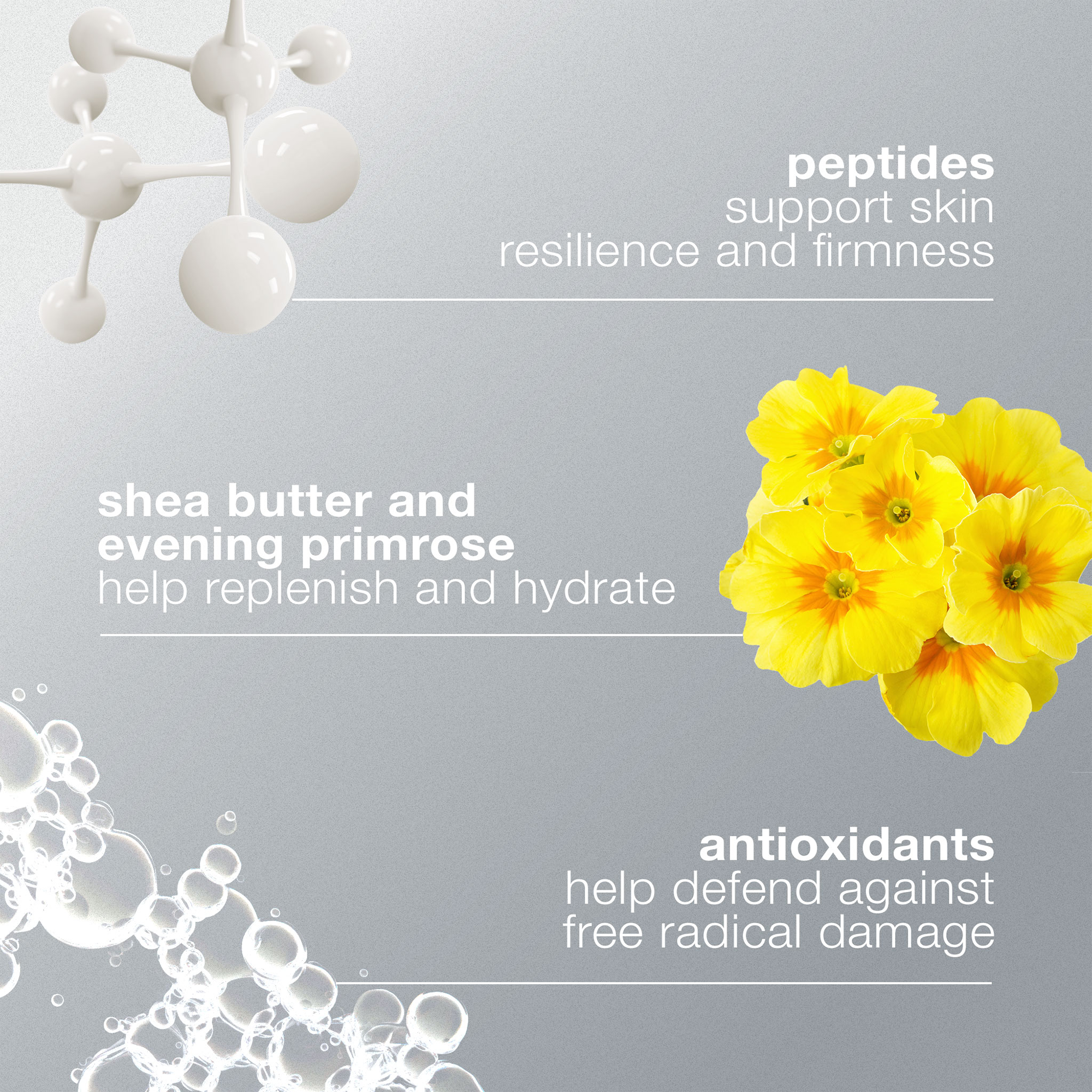 - Powerful peptides and acid-free smoothing complex support skin resilience and tone.