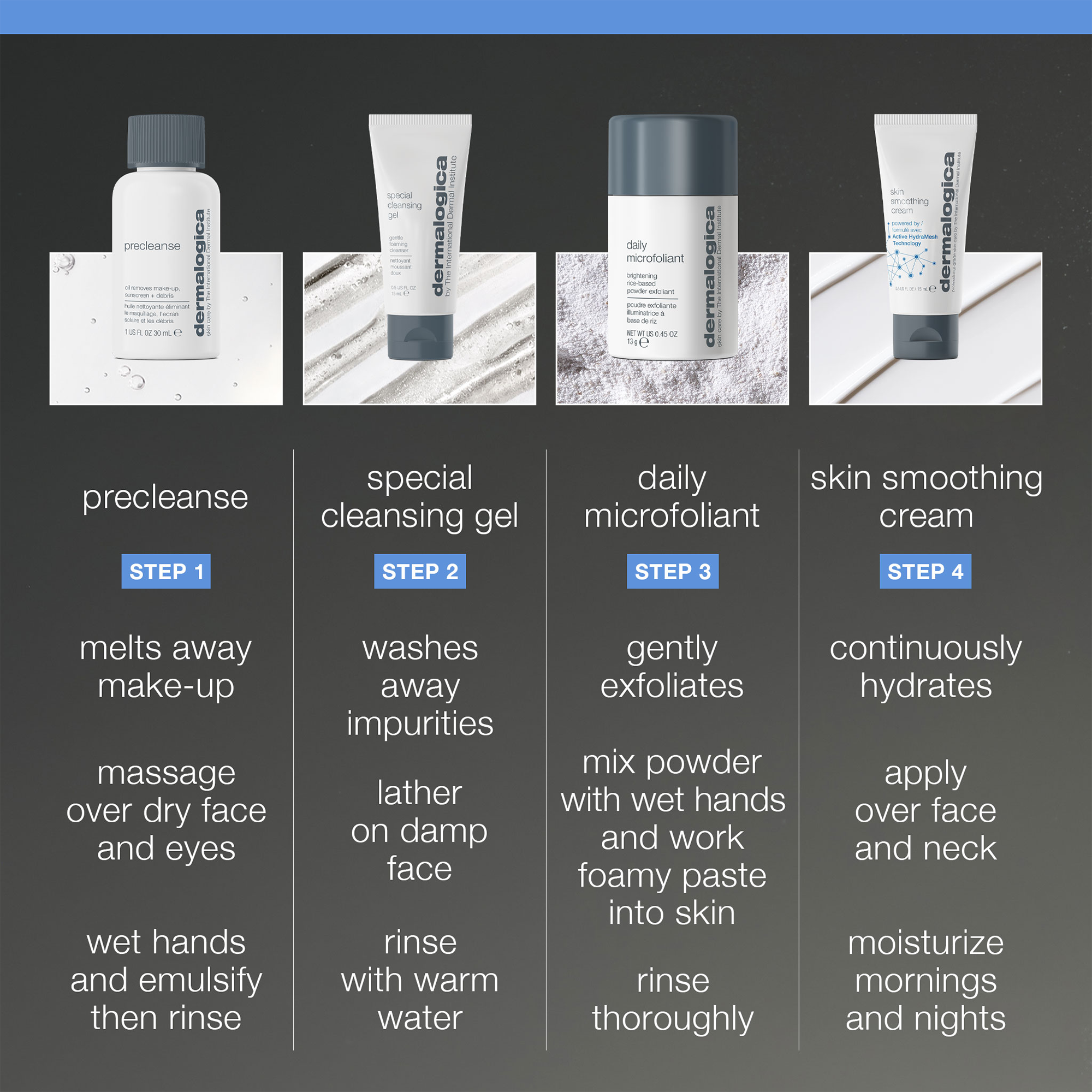 This kit includes Precleanse 30 ml (deep-cleansing oil), Special Cleansing Gel 15 ml (soap-free, foaming gel cleanser), Daily Microfoliant 13 g (gentle, brightening polisher), and Skin Smoothing Cream 15 ml (medium-weight moisturizer) to provide a deep cleanse, gentle exfoliation, and hydration to your skin.