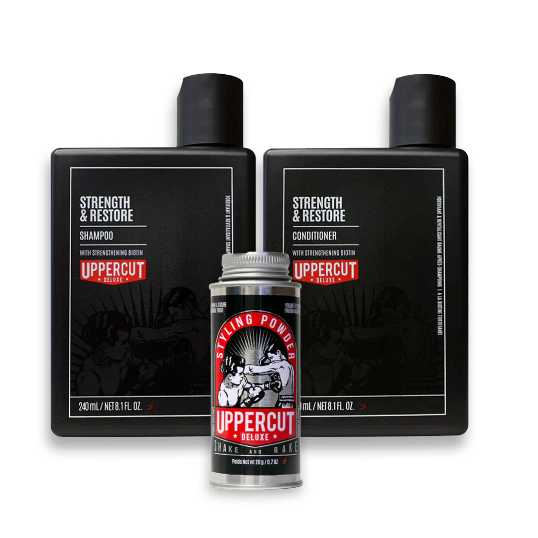 Get the ultimate styling experience with the Uppercut Deluxe Styling Powder Hair & Styling Bundle. This bundle includes the Uppercut Deluxe Styling Powder 20g, Uppercut Deluxe Strength and Restore Shampoo 240ml, and Uppercut Deluxe Strength and Restore Conditioner 240ml.